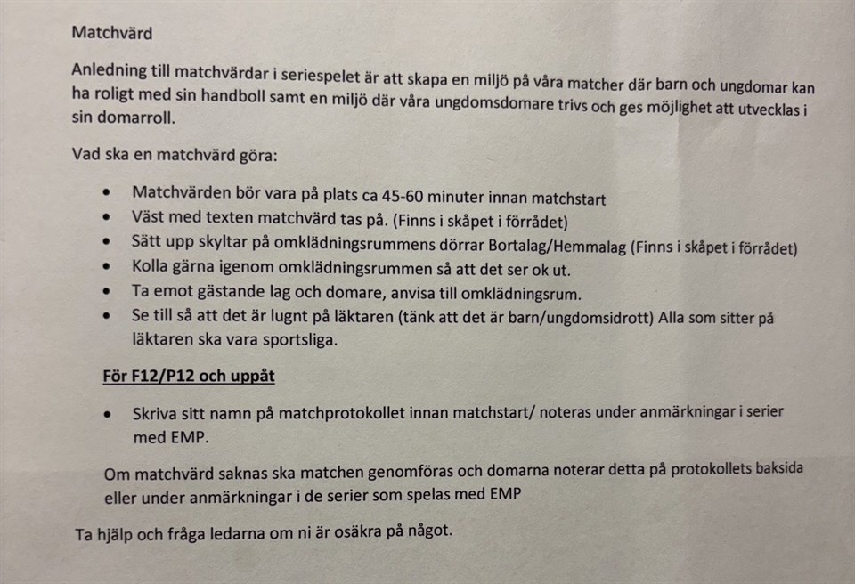 Hej! Söndag 25 januari är det sammandrag igen. Kallelse är utskickad, en per match. Svara på båda och gärna så snart ni kan! Matcherna spelas i Hestrahallen vilket alltså innebär att det är vi som arrangerar. Det är tre matcher: 10.00 Byttorp-Bollebygd 11.10 Bollebygd-Särökometerna 12.15 Byttorp-Särökometerna Vi behöver hjälp med följande: Kiosken: Minst två personer. Den som öppnar kiosken behöver vara på plats senast 9.15 för att förbereda. Manual finns på skåpsdörrarna inne i bollförrådet i hallen. Kiosken behöver vara öppen tillräckligt länge för att lagen som spelat sista matchen ska hinna handla innan de åker hem. Sekretariatet: Två personer som kan sköta klockan under matcherna. Ni behöver vara på plats från 9.30-13.15. Matchvärd: En person som kan vara på plats 9.15-13.30. Det är bra om samma person kan ta detta ansvar under hela dagen. Bifogat finns en beskrivning av vad det innebär att vara matchvärd. Fem minuter före matchstart ska matchvärden även sammankalla domare, sekretariatet och en ledare från varje match till #schysstmatch. Syftet är att påminna om att det ska vara en trygg matchmiljö för alla. Vi är tacksamma om ni kan skriva i kommentarsfältet vad ni kan hjälpa till med. Vi ser gärna att ni skriver även om ni inte kan denna gång. Tusen tack på förhand från oss ledare! Handboll F9/F10 (2016/2015) 15 jan 14kommentarer
